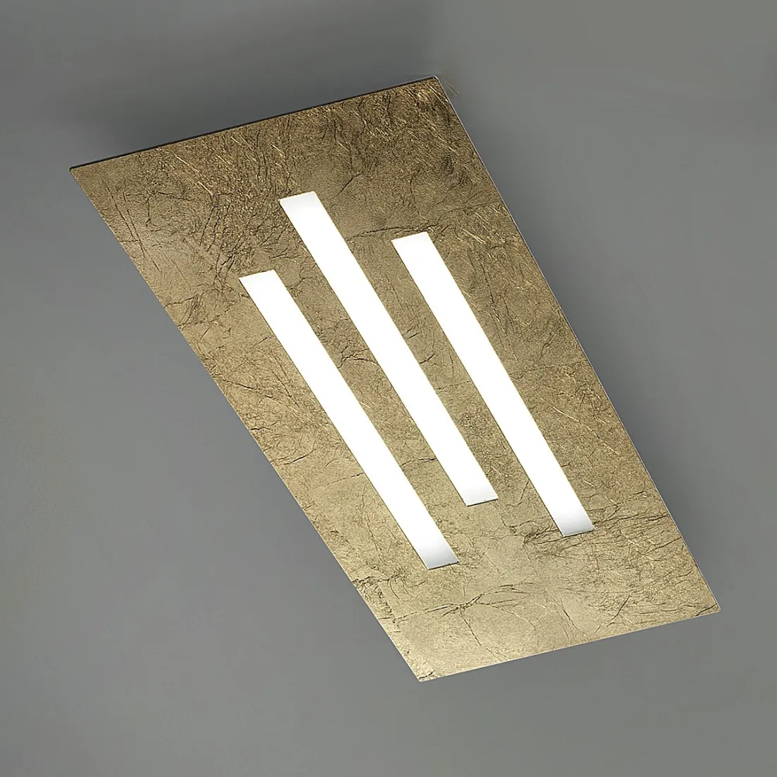 GAMMA PL50 est un plafonnier rectangulaire avec trois bandes lumineuses décalées, éléments d'ameublement tendance. Il combine la technologie LED basse consommation moderne avec le charme du métal feuille d'OR qui produit une lumière chaude et agréable. Si autrefois cette couleur était synonyme d'ennui et de tristesse, elle est aujourd'hui devenue synonyme d'élégance et de raffinement. En plus de cette couleur, le plafonnier est disponible en gris tourterelle, feuille d'argent ou blanc.