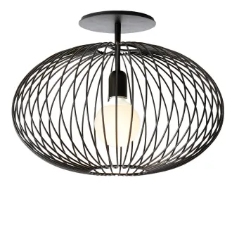 Structure en tige d'acier peinte avec des poudres époxy dans les tons ivoire ou noir mat. Sur demande, il est possible de monter l'accessoire abat-jour en tissu texturé blanc pour recouvrir l'ampoule. Le plafonnier monte une douille E27 pour une ampoule halogène, basse consommation ou LED. Ampoule non incluse.