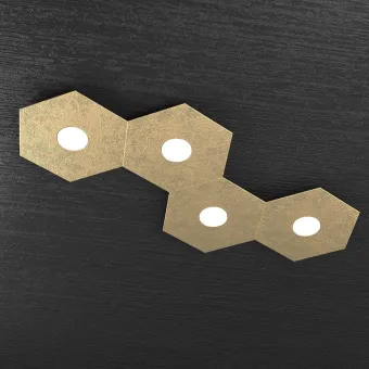 Collection de lampes hexagonales composées de plaques métalliques peintes en différentes finitions, BLANC, GRIS, SABLE, MARRON, GRIS, ANTHRACITE, FEUILLE D'ARGENT, FEUILLE D'OR ou FEUILLE DE CUIVRE. Le plafonnier supporte quatre douilles GX53 pour une ampoule LED de 9W max non incluse.