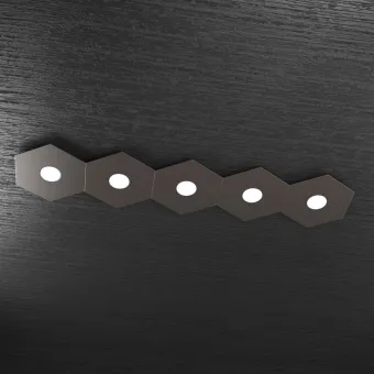 Collection de lampes hexagonales composées de plaques métalliques peintes en différentes finitions, BLANC, GRIS, SABLE, MARRON, GRIS, ANTHRACITE, FEUILLE D'ARGENT, FEUILLE D'OR ou FEUILLE DE CUIVRE. Le plafonnier supporte cinq douilles GX53 pour une ampoule LED de 9W max non incluse.