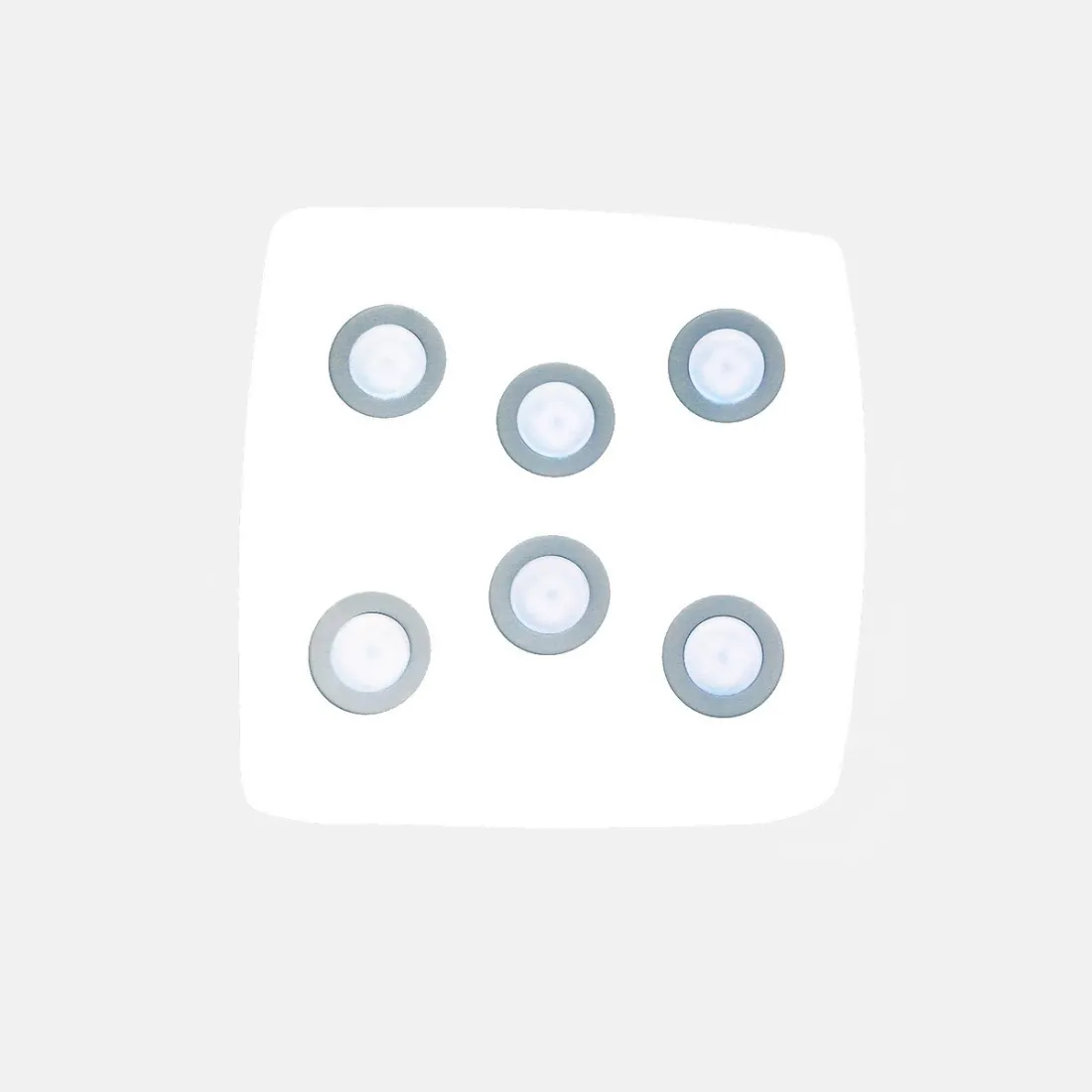 Structure en métal BLANC et anneaux GRIS . Sur demande, l'anneau central est interchangeable en couleurs peintes blanc, noir, gris ou sable ou décoré de feuilles d'argent, d'or ou de cuivre. L'applique ou le plafonnier est équipé de six douilles GX53 pour une ampoule LED de 7W max non incluses.