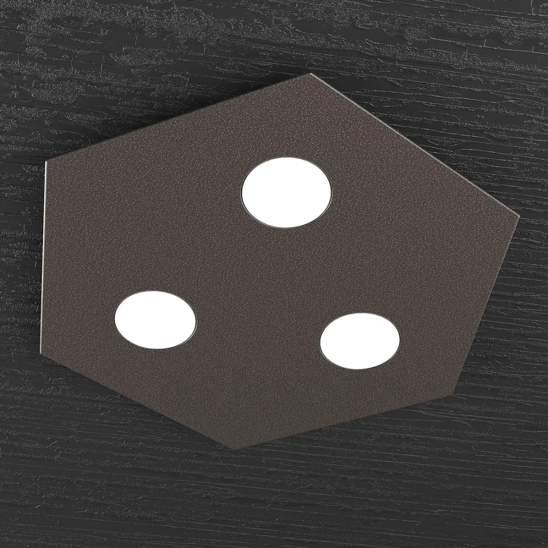 Collection de lampes hexagonales composées de plaques métalliques peintes en différentes finitions, BLANC, GRIS, SABLE, MARRON, GRIS ANTHRACITE, FEUILLE D'ARGENT, FEUILLE D'OR ou FEUILLE DE CUIVRE. Le plafonnier supporte trois douilles GX53 pour une ampoule LED de 9W max non incluse.