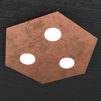 Collection de lampes hexagonales composées de plaques métalliques peintes en différentes finitions, BLANC, GRIS, SABLE, MARRON, GRIS ANTHRACITE, FEUILLE D'ARGENT, FEUILLE D'OR ou FEUILLE DE CUIVRE. Le plafonnier supporte trois douilles GX53 pour une ampoule LED de 9W max non incluse.