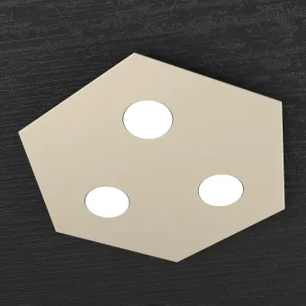 Collection de lampes hexagonales composées de plaques métalliques peintes en différentes finitions, BLANC, GRIS, SABLE, MARRON, GRIS ANTHRACITE, FEUILLE D'ARGENT, FEUILLE D'OR ou FEUILLE DE CUIVRE. Le plafonnier supporte trois douilles GX53 pour une ampoule LED de 9W max non incluse.