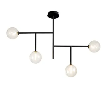 Structure en métal peint noir mat. Diffuseurs sphères en verre transparent diamètre 12 centimètres. Le plafonnier est équipé de quatre douilles G9 pour ampoules LED non incluses.