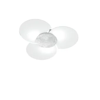 La collection CLOVER présente une structure en métal blanc et des diffuseurs ronds en verre en feuille extra-clair sérigraphiée blanche. La plaque centrale est fixée par des aimants et est disponible en différentes finitions, sable, chrome, anthracite ou travaillée à la feuille d'or, à la feuille d'argent ou à la feuille de cuivre.