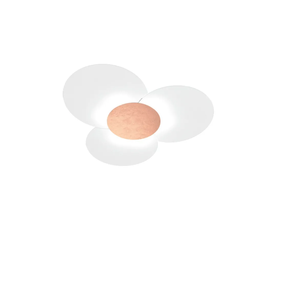 La collection CLOVER présente une structure en métal blanc et des diffuseurs ronds en verre en feuille extra-clair sérigraphiée blanche. La plaque centrale est fixée par des aimants et est disponible en différentes finitions, sable, chrome, anthracite ou travaillée à la feuille d'or, à la feuille d'argent ou à la feuille de cuivre.