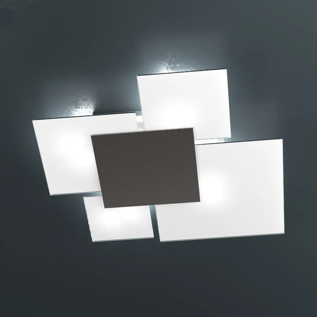 Verre en plaque sérigraphiée extra clair blanc, gris, sable, marron, gris anthracite ou réalisé artisanalement à la feuille d'or, d'argent ou de cuivre. Métal chromé poli. Le plafonnier accueille quatre douilles avec douille E27 pour ampoules halogènes ou led. Lampes non incluses.