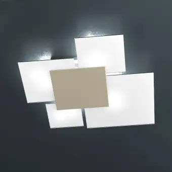 Verre en plaque sérigraphiée extra clair blanc, gris, sable, marron, gris anthracite ou réalisé artisanalement à la feuille d'or, d'argent ou de cuivre. Métal chromé poli. Le plafonnier accueille quatre douilles avec douille E27 pour ampoules halogènes ou led. Lampes non incluses.