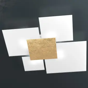 Verre en plaque sérigraphiée extra clair blanc, gris, sable, marron, gris anthracite ou réalisé artisanalement à la feuille d'or, d'argent ou de cuivre. Métal chromé poli. Le plafonnier accueille quatre douilles avec douille E27 pour ampoules halogènes ou led. Lampes non incluses.