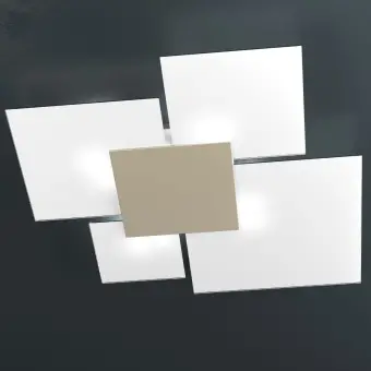 Verre en plaque sérigraphiée extra clair blanc, gris, sable, marron, gris anthracite ou réalisé artisanalement à la feuille d'or, d'argent ou de cuivre. Métal chromé poli. Le plafonnier accueille quatre douilles avec douille E27 pour ampoules halogènes ou led. Lampes non incluses.