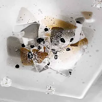 Le verre, qui se présente sous forme de plaques d'épaisseur variable, est découpé par le maître en différentes formes, puis par la suite, le dessin est composé à partir des différents types de verre fabriqués. Fils, bouffées, grains et poudres et c'est ainsi qu'un objet unique et inimitable prend forme à partir d'une idée. Après avoir été travaillé et composé, le verre est placé dans le four par le maître, où après les touches finales, il est fondu à une température de 800°-810°, et laissé à tempera pendant environ 8 heures pour ensuite assister à la magie de la fusion où tous les différents composants contribuent à la création de l'œuvre d'art.