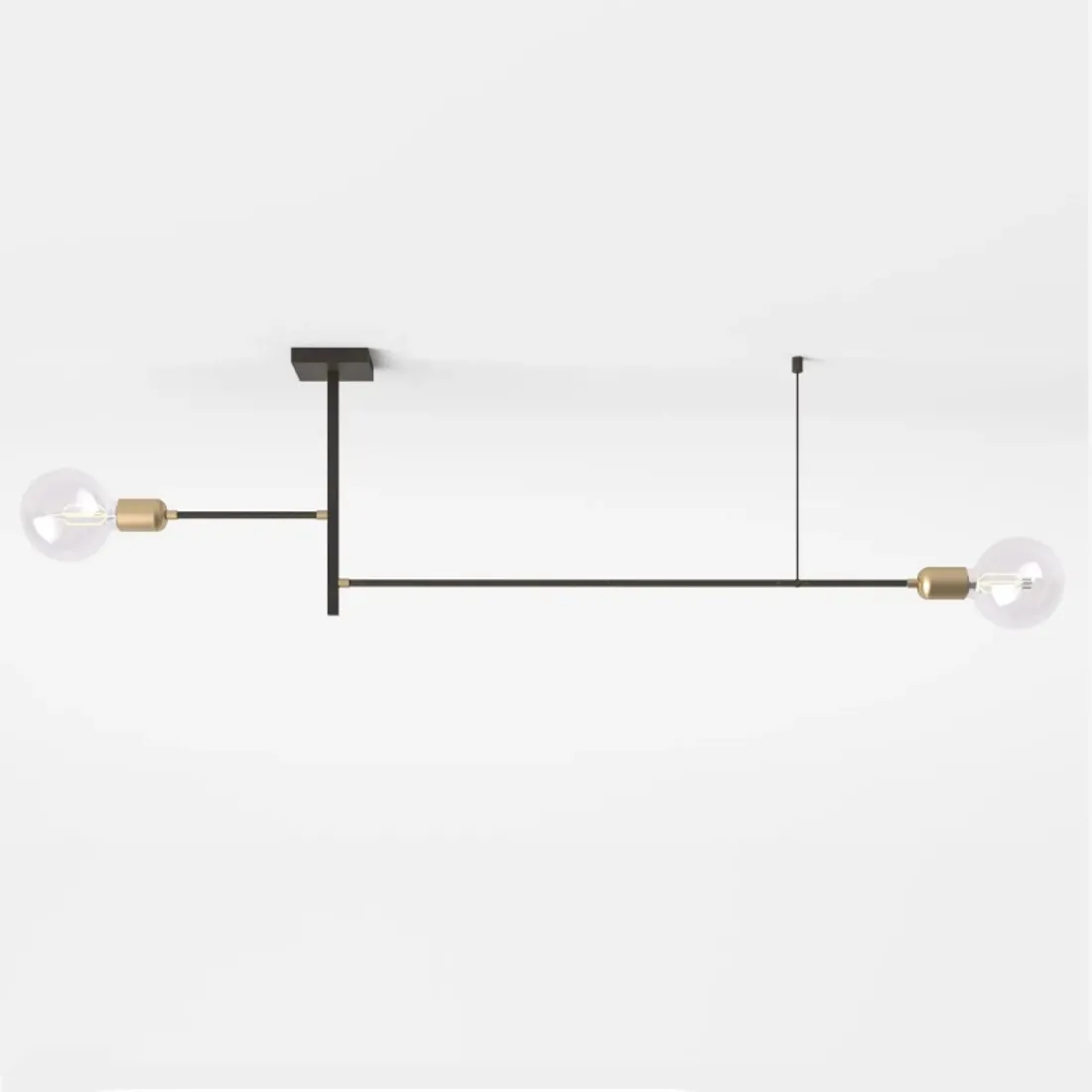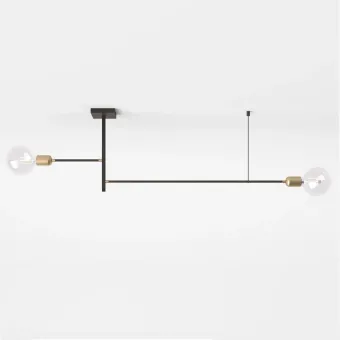 Plafonnier réalisé avec des tubes en métal peints avec des poudres époxy en laiton brossé, brun doré, ivoire doré et décoré à la main. Les détails sont en laiton brossé. Le plafonnier accueille deux douilles E27 pour ampoules halogènes ou LED. Ampoules non incluses.