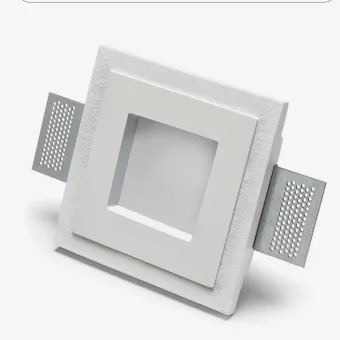 Corps en plâtre blanc qui peut également être peint avec des couleurs spéciales à base d'eau, comme la teinte de votre plafond ou toute autre couleur de la pièce. Le cadre brut mis en valeur autour du spot est destiné à faciliter l'ancrage du stuc. Après avoir tout mis en place, c'est-à-dire jointoyer et lisser, la surface environnante restera complètement uniforme.