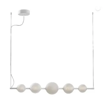 Le sfere sono realizzate in vetro e proposte in dimensioni differenti, creando un gioco di volumi armonioso e decorativo. La lavorazione effetto alabastrato dona alla superficie un aspetto morbido e materico, capace di diffondere la luce in modo uniforme e raffinato, richiamando l’eleganza delle pietre naturali.