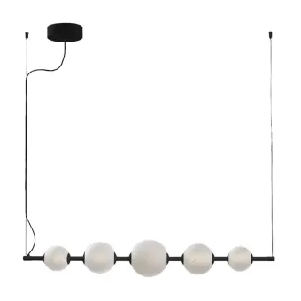 Le sfere sono realizzate in vetro e proposte in dimensioni differenti, creando un gioco di volumi armonioso e decorativo. La lavorazione effetto alabastrato dona alla superficie un aspetto morbido e materico, capace di diffondere la luce in modo uniforme e raffinato, richiamando l’eleganza delle pietre naturali.