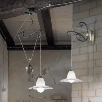 Il lampadario CUNTRY LINE 1824 è complete di contrappeso che consente di regolare l'altezza del diffusore secondo le necessità. Questo lampadario si fa notare in qualsiasi contesto, arredando e diventando un punto focale di ambienti residenziali, ma anche di alberghi, ristoranti, luoghi d'incontri ecc... ecc... Si sposa perfettamente con gli impianti di corrente elettrica esterna ai muri, abbinata ai nostri cavi intrecciati che disegnano architetture straordinarie sul soffitto.