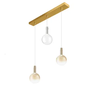 Ampolla S3 è una sospensione a tre luci che unisce eleganza materica e forme delicate. I diffusori in vetro borosilicato, due in ambra e uno trasparente, creano un contrasto luminoso raffinato. Le calate sfalsate e regolabili aggiungono movimento e armonia, rendendola perfetta sopra penisole, tavoli o come punto luce decorativo in ambienti con soffitti di diverse altezze.