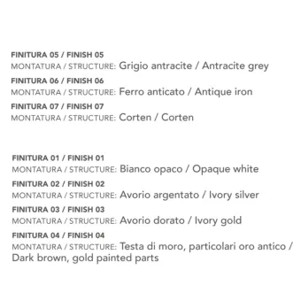 - Metallo bianco opaco, avorio argentato, avorio dorato, testa di moro con particolari oro, grigio antracite, ferro anticato o corten
