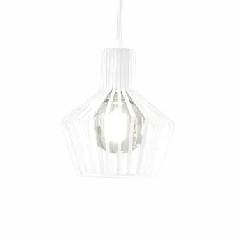 Il suo design si distingue per una particolare forma: una struttura in metallo a strisce che sembra "ingabbiare" la lampadina, creando un effetto visivo moderno e intrigante. Nonostante l'aspetto strutturato, la luce viene diffusa in modo uniforme in tutta la stanza.