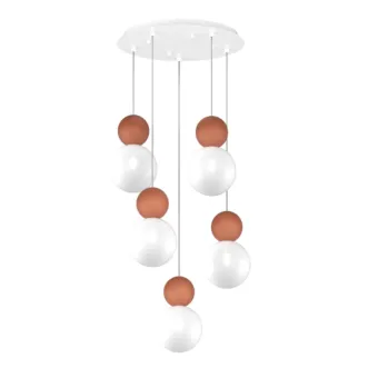 COTTAGE 1228/S5 T è una sospensione dal design contemporaneo e raffinato, studiata per aggiungere luce e stile agli ambienti moderni. La sua composizione scenografica prevede cinque luci con sfere pendenti da una base tonda in metallo bianco di Ø 40 cm, creando un effetto visivo di grande impatto estetico.