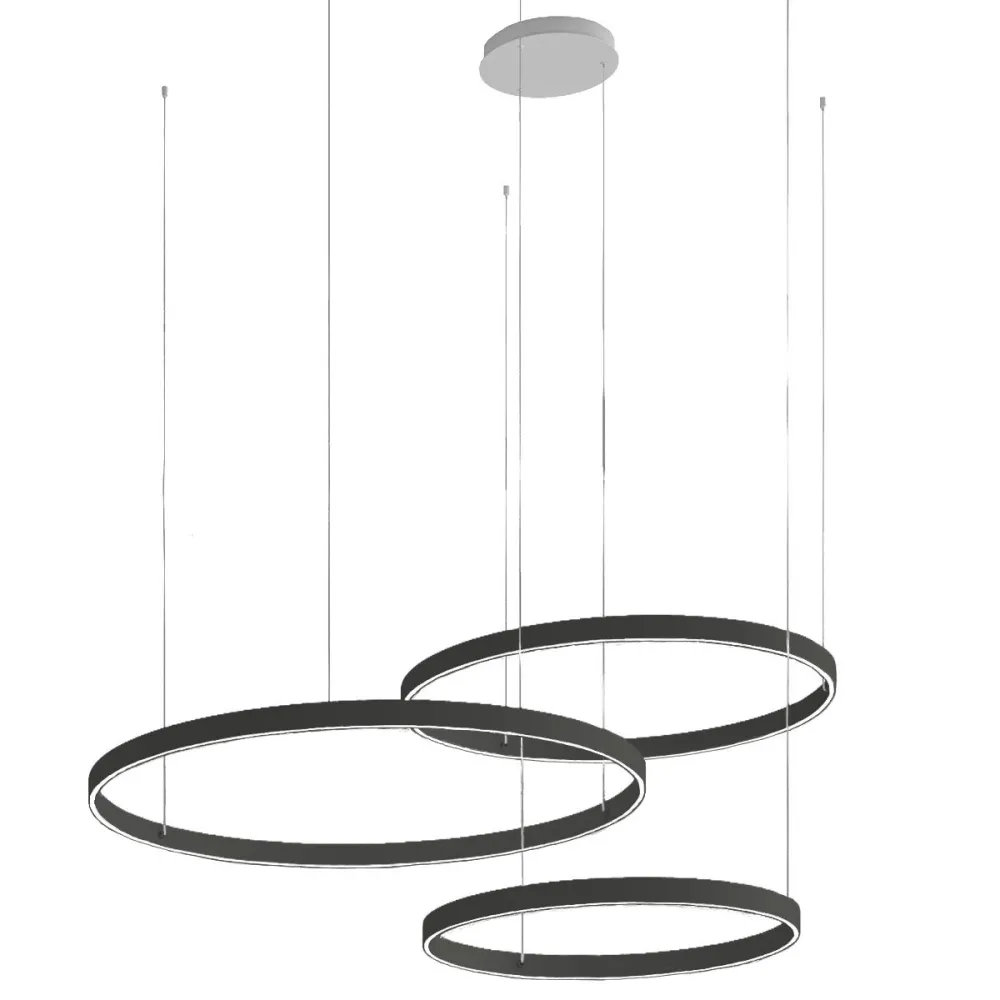 Il GAME TRIS S40+S60+S80 è una sofisticata lampada a sospensione che unisce design moderno e funzionalità avanzate, composta da tre cerchi luminosi di diametro 40 cm, 60 cm e 80 cm. La sua struttura elegante e versatile si distingue per l’emissione di luce sia verso l’alto che verso il basso, creando un’illuminazione avvolgente e scenografica. Supportata da una robusta base da soffitto e decentramenti regolabili, questa lampada permette di personalizzare l’altezza fino a un massimo di 300 cm, adattandosi perfettamente a ogni ambiente.