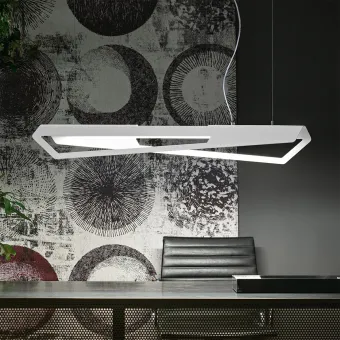 Sospensione ultramoderna e di singolare design. Un corpo illuminante realizzato da geometrici elementi in metallo che definiscono linee precise e definite. Un lampadario essenziale che si rende adatto per ambienti sia domestici che uffici. Un prodotto Made in Italy.