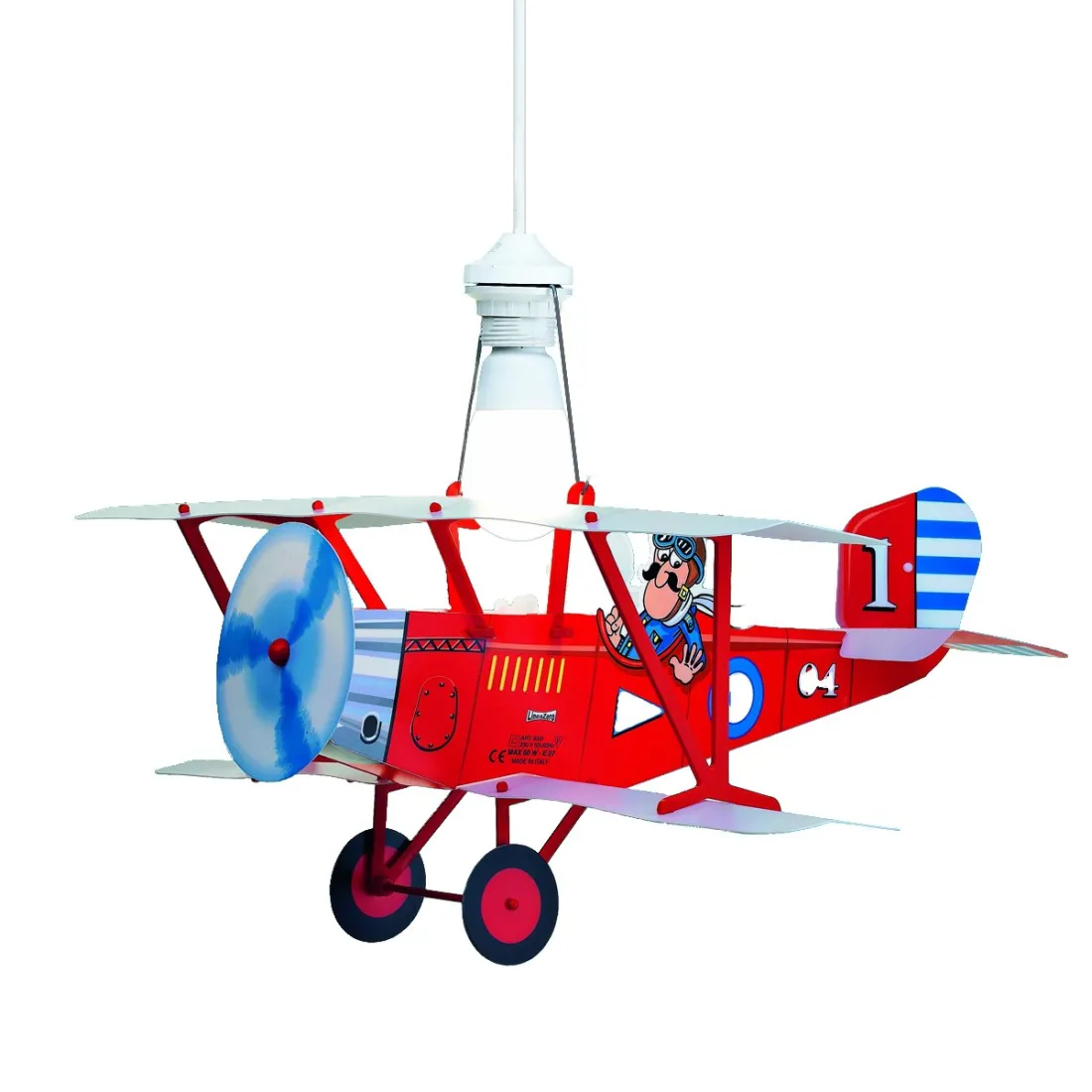 Lampadario per chi ama essere sempre fra le nuvole e vedere tutto dall'alto. Per i bambini che amano volare e sognare fra le spumose nuvole che sembrano panna. Un originale biplano dai colori decisi e allegri. Illuminare i propri spazi con allegria.