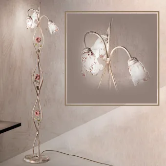 Lampada da terra classica floreale composta da fiori di metallo sulla struttura e impreziosita da tre vetri affascinanti. Illumina e arreda qualunque stanza della casa; soggiorno, camera, ingresso, ecc... Un prodotto firmato Made in Italy.