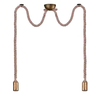 Montatura in metallo, ottone invecchiato. Cordone in yuta regolabile in altezza. La sospensione a 2 luci è provvista di due portalampade attacco E27 per lampadine a led o alogena da 60W max. Lampade escluse.