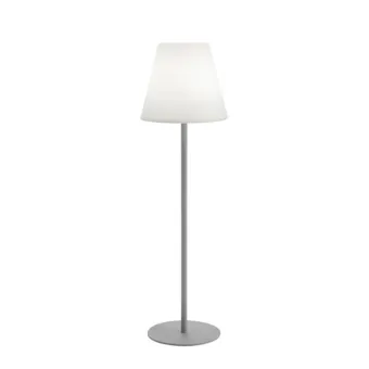 Lampada da terra da esterno dalla semplice forma con paralume in resina bianca ma dallo spettacolare effetto luce che emana intorno a se. Una piantana a luce diffusa che trova piena complicità con l'ambiente circostante e risalta nel verde.