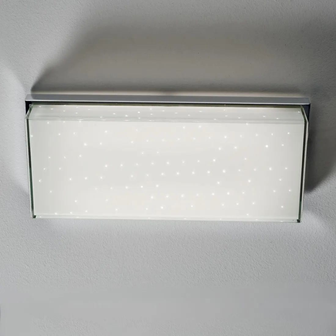 La plafoniera a led BRILLA PL RE ha una forma rettangolare, piace per il colore bianco e la forma semplice. Il design minimalista è impreziosito da un'effetto cielo stellato. Questo accorgimento ne fa un colpo d'occhio di stile. La lampada si può montare sul soffitto ed anche sulle pareti. La struttura è in metallo cromato e il diffusore è in vetro serigrafato bianco lucido con puntini trasparenti, che si fonde ottimamente con la superficie lasciando tutto il protagonismo all'effetto delle sorgenti luminose a led nascoste sotto il vetro. Emissione di luce diffusa che arreda ogni stanza come: camera, soggiorno, cucina, ingresso, ecc...