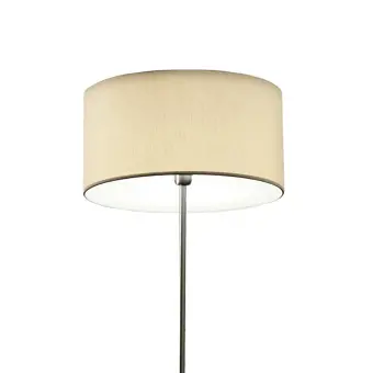 Struttura in metallo nikel satinato con stelo diritto, finito da un paralume in tessuto TORTORA, SABBIA o NOCCIOLA; all'interno rivestito in PVC bianco.