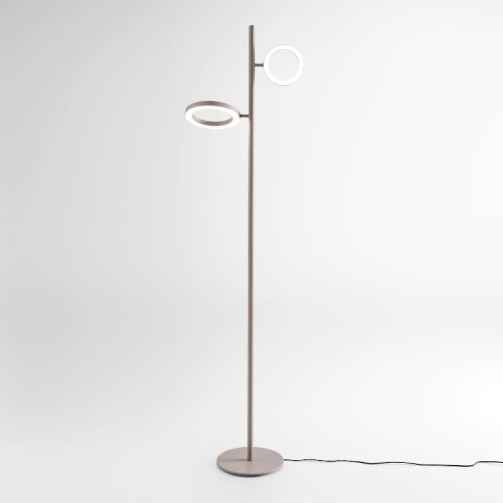 Linee sottili e geometria rigorosa si fondono in questa lampada da terra GPIT32, pensata per chi cerca un elemento di design minimale ma efficace. La struttura verticale, in metallo verniciato, ospita due anelli LED orientabili con fascio luminoso ampio a 120°, ideale per illuminare angoli lettura, spazi studio o ambienti living moderni.