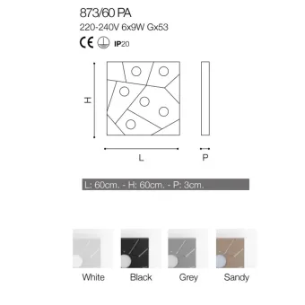 Struttura in metallo verniciato bianco (white), sabbia (sandy), nero (black) o grigio (grey). La plafoniera è provvista di sei portalampade attacco GX53 per lampadine a Led da 9W max. Lampadine escluse. Made in Italy