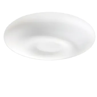 Plafoniera da soffitto semplicemente tonda ma singolare nella sua incavatura centrale del vetro. Un vetro soffiato bianco a luce diffusa da collocare in qualsiasi stanza, per qualsiasi uso e da fissare sia a parete che a soffitto.