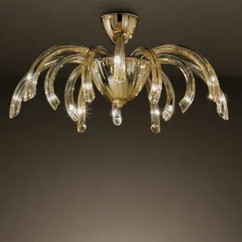 Plafoniera realizzata da vetrai artisti di Murano, una forma originale che si fa notare in ogni sua collocazione, sia in ambienti moderni che classici. Esuberanza nelle forme e funzionalità creano un punto luce unico per caratteristiche e design. Made in Italy.