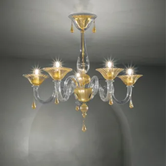 Equilibrio e simmetria definiscono la rigorosa eleganza della plafoniera le cui linee tradizionali si evolvono in uno stile adatto ad ogni tipo di ambiente. La composizione è caratterizzata dalla forma inedita dei bracci che vengono annodati e rigati durante la lavorazione del vetro soffiato. La collezione DOLFIN si completa con una preziosa versione realizzata in oro 24k applicato a caldo durante la lavorazione. La plafoniera fa parte di uno stile classico ed elegante adatto ad ogni tipo di arredamento, ma ideale al centro della stanza dove esso diventa protagonista.
