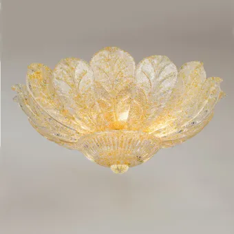 La struttura della plafoniera è in metallo oro 24K. Vetro in graniglia ambra.